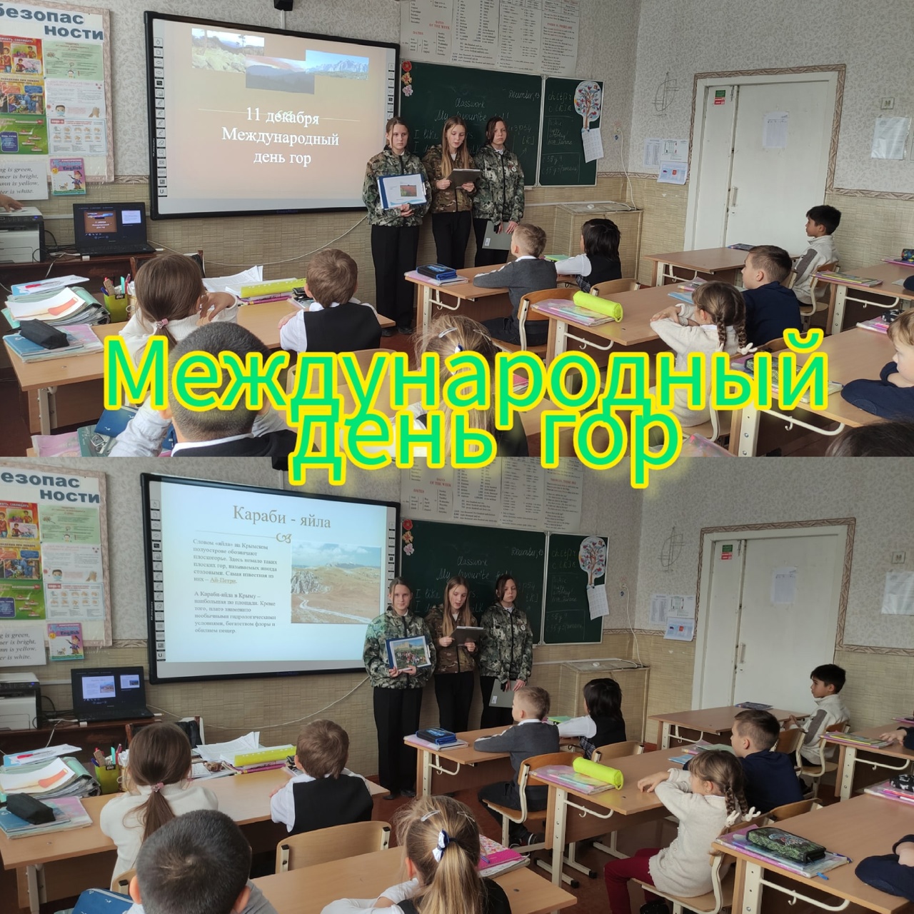 11 декабря отмечался Международный день гор. Ребята из школьного лесничества "Зелёный патруль" не остались в стороне и провели в 3Б, 2В, 2Г классах уроки экологических знаний по теме "Ак-Кая, флора и фауна", " Флора и фауна на Караби яйле". Ребята рассказали об образовании Белой Скалы, месте расположения,так же о флоре и фауне населяющих Караби яйле, а так же об ООПТ.